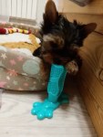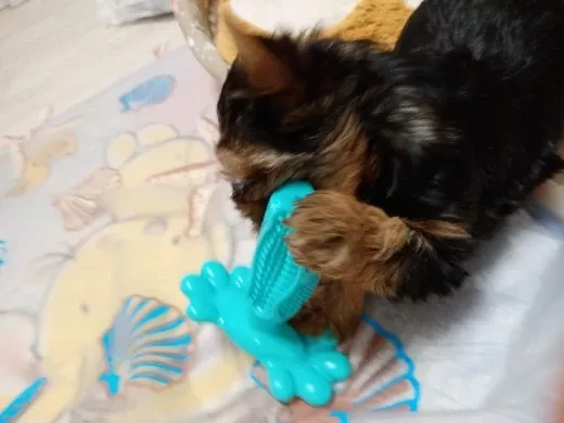 This is a high-quality chew toy. My 5-month-old Yorkie finds it a bit large even in the smallest size, but I plan to reintroduce it later. It’s odor-free, which is a plus.