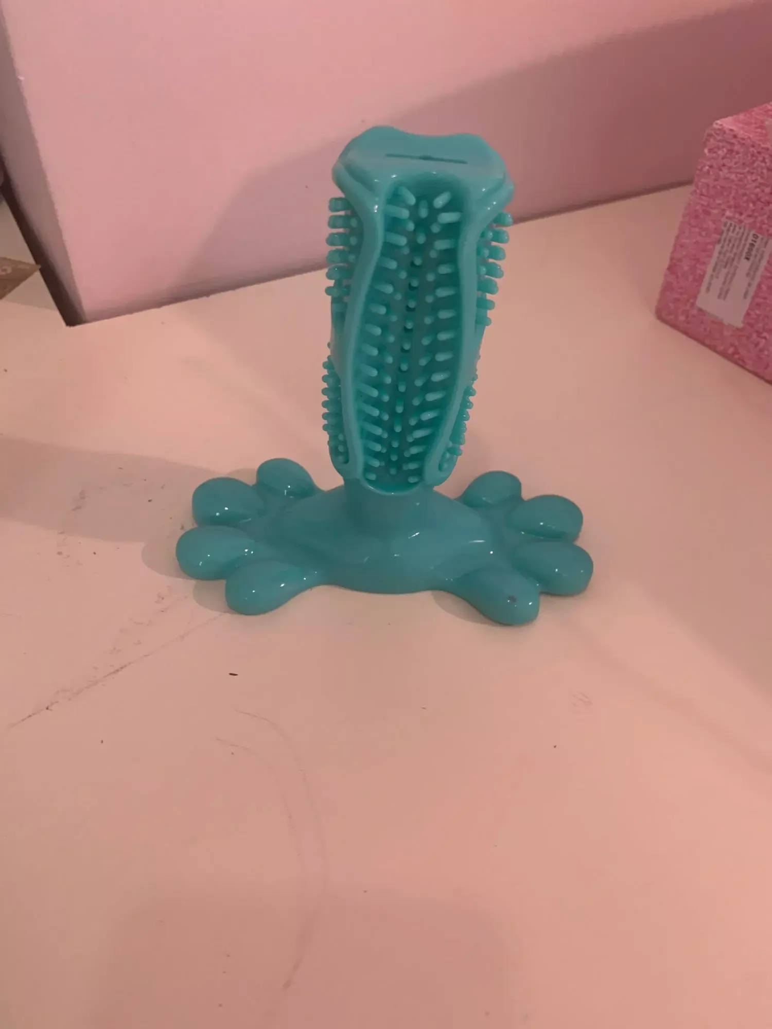 My dog was initially wary but now uses it more. She chews on the paw-shaped supports but the toy seems durable. Haven’t tried toothpaste yet.