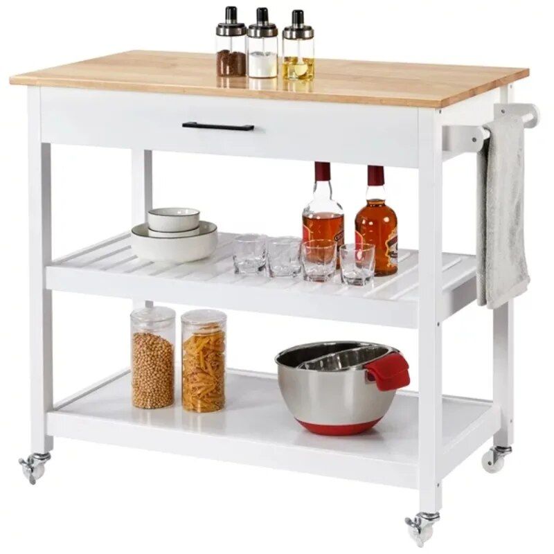 Our kitchen island cart stands out for its functional design and elegance. The solid construction ensures it withstands the hustle and bustle of your kitchen, while the ample storage space keeps your essentials organized. The smooth-rolling casters allow you to move the cart effortlessly, making it ideal for kitchens of any size. Whether you’re prepping meals, serving drinks, or need extra counter space, this cart is your go-to solution.